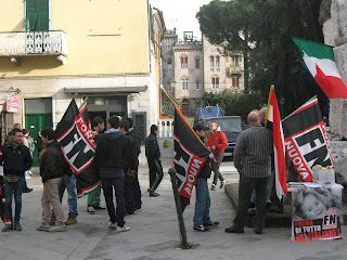 2) Forza Nuova non ha sottratto la piazza a nessuno tanto meno alle decine di giovani spezzini e di Sarzana che hanno manifestato con noi. I dirigenti locali del Movimento, infatti, hanno fatto regolare richiesta al Comune per l’occupazione di suolo pubblico e ci è stata concessa piazza Garibaldi cosi come gli altri partiti politici hanno occupato le altre piazze principali ( Piazza Lumi in primis). Forza Nuova è un movimento politico con decine di rappresentanti nelle istituzioni a livello nazionale e non si capisce proprio il perché dovrebbe essere trattata in maniera differente!!